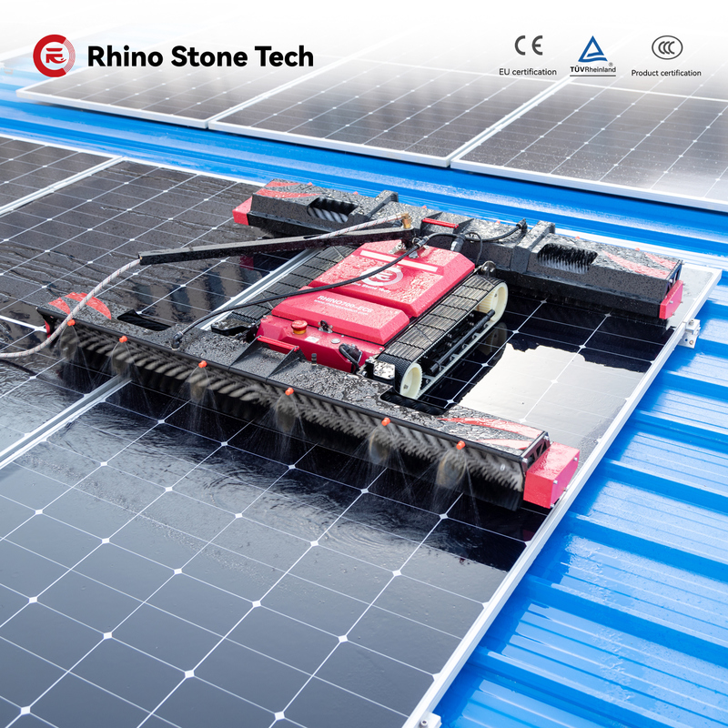 The RHINO700-EC6 Remote-Controlled Crawler Solar Panel Cleaner boasts two adaptive extra-wide floating roller brushes—one positioned at the front and the other fastened at the rear. These brushes sustain non-stop contact with the surfaces of solar modules, thereby delivering thorough cleaning outcomes leaving no streaks whatsoever. A smart parking and storage function is built into the robot; this not only prevents the brushes from distorting but also extends the device’s service life. What’s more, the robot’s integrated anti-fall system enhances operational safety: it allows the robot to run steadily even when traversing complex terrains, which further makes solar panel cleaning safer, more efficient, and less reliant on manual labor.