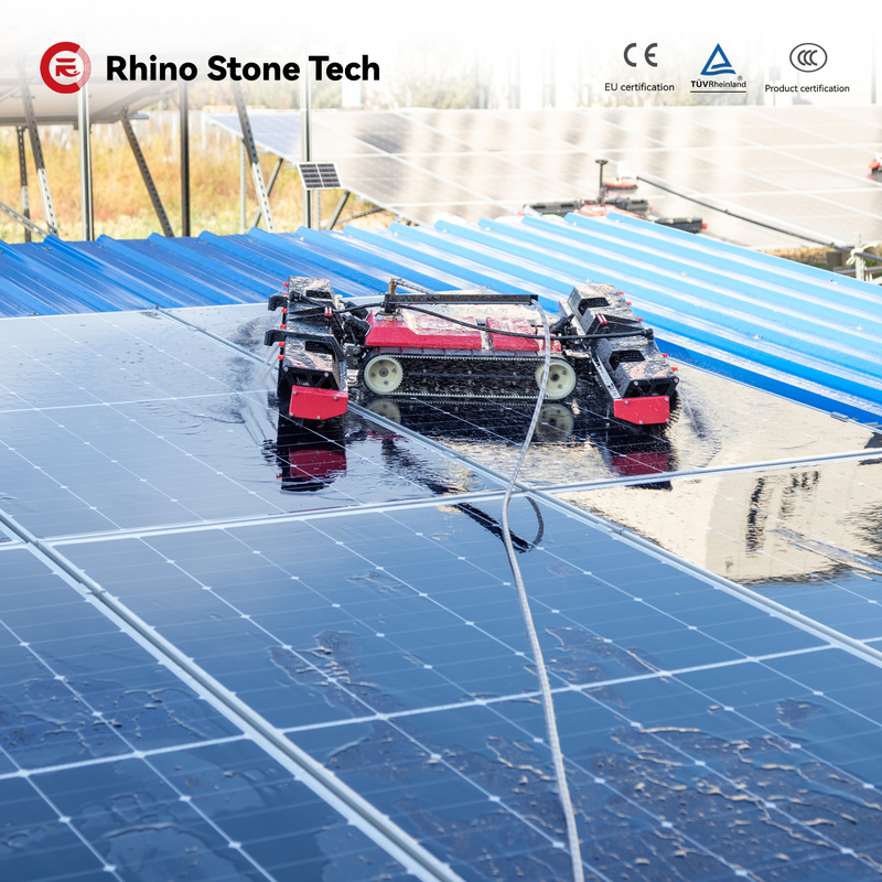 The RHINO700-EC6 Remote-Controlled Crawler Solar Panel Cleaner shines with impressive operational performance, thanks to its two adaptive extra-wide floating roller brushes—one fitted at the front and the other anchored at the rear. These brushes maintain non-stop contact with solar module surfaces, ensuring a complete cleaning process that leaves no streaks at all.