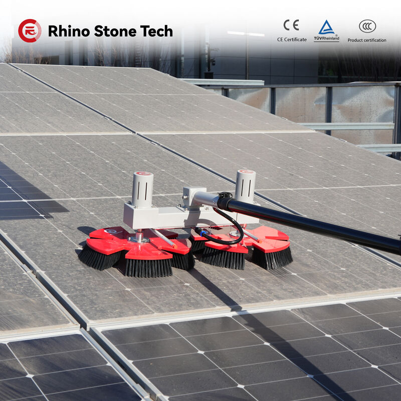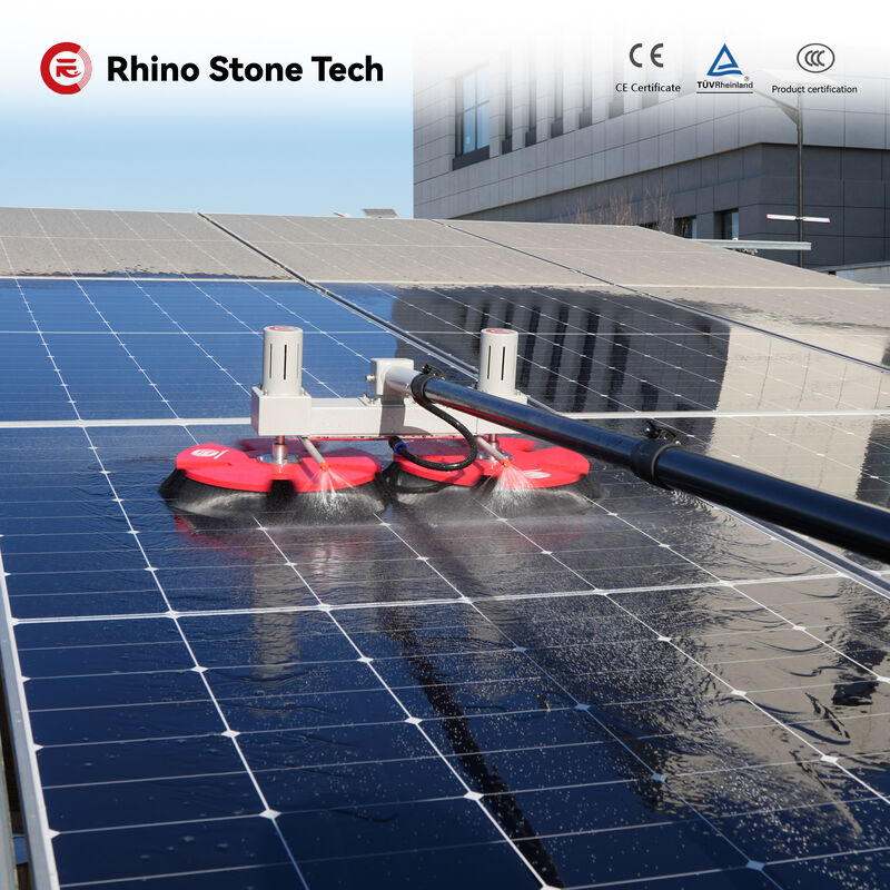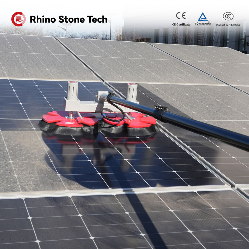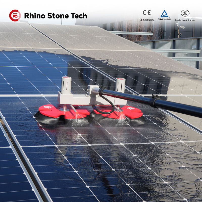 The RHINO700-EH2 Twin-Disc Solar Panel Washer features an exclusive five-lobe brush head structure developed by our own team. Adhering to the core concept of "High Efficiency, Safety and Panel Protection", this cleaning machine is equipped with dual-direction rotating brush heads combined with antistatic nylon bristles. It can quickly remove tough stains and dirt, while providing reliable protection to avoid scratches and damages to solar panels. Built with a high-strength, durable and antistatic carbon fiber telescopic rod, the product significantly reduces operator fatigue, enhances work safety and extends long-term service life—making it a premium choice for efficient solar panel cleaning.