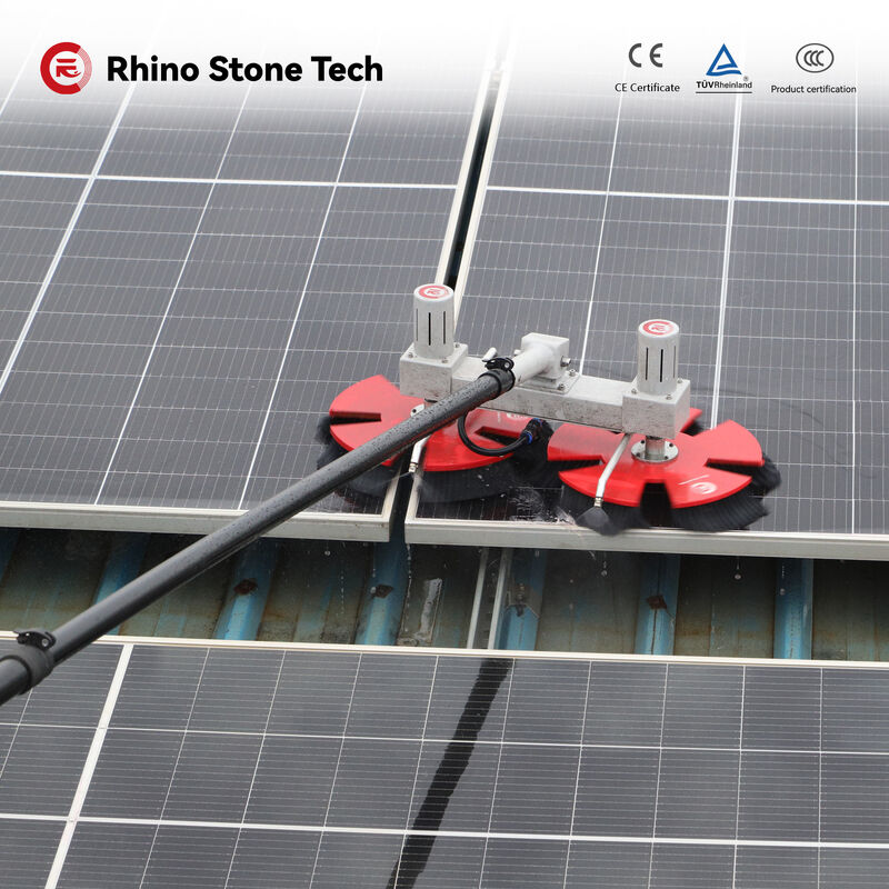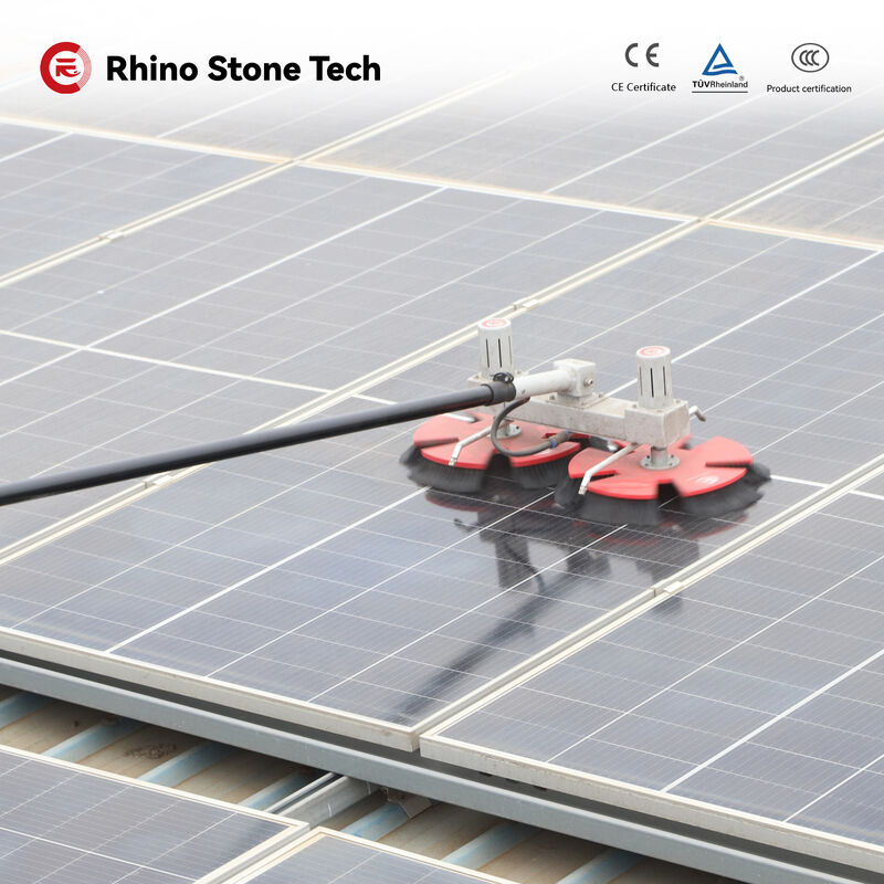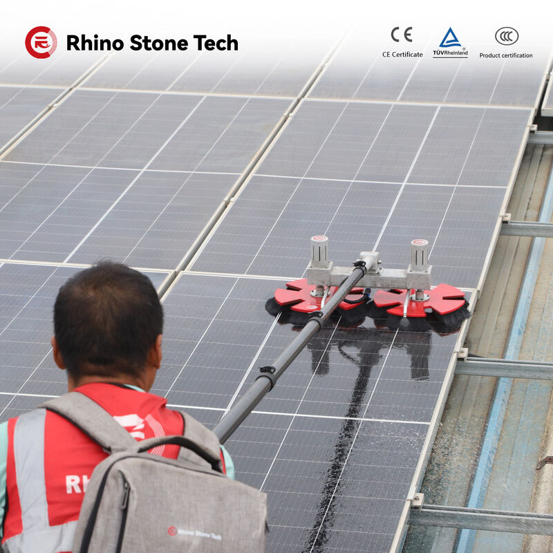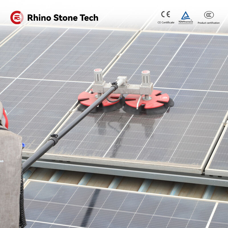 The RHINO700-EH2 Dual-Disc PV Cleaning Brush comes with a unique five-petal brush head, developed around the core concepts of efficient cleaning, safe operation, and maximum protection for photovoltaic panels. Its two rotatable brush sets, equipped with anti-static nylon bristles, can quickly wipe off obstinate dust and accumulated dirt from the surface of PV panels without leaving any scratches or causing damage to the glass. Made from a high-toughness, elastic and anti-static carbon fiber telescopic rod, this cleaning tool effectively reduces the physical burden on operators, while improving overall safety, service life and structural stability. It is recognized as a high-end professional option for large-scale photovoltaic panel cleaning and maintenance work.